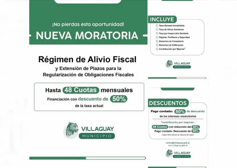 Régimen de Alivio Fiscal y Extensión de Plazos para la Regularización de Obligaciones Fiscales que propone la municipalidad de Villaguay con hasta 48 Cuotas mensuales y financiación con descuento de 50% de la tasa actual.